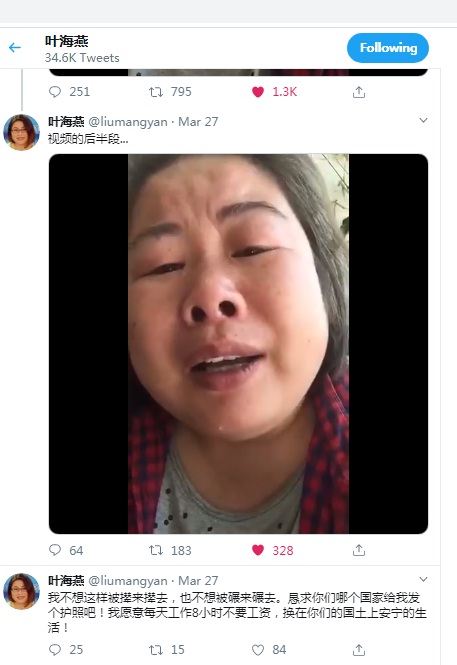 On March 27, 2020, a once-applauded Chinese feminist activist Ye Haiyan (@liumangyan) posted a series of Tweets sobbing and pleading for help. In the videos, she said the local government of Inner Mongolia had been harassing and threatening her for months. She implored her thousands of followers overseas (including celebrities like Ai Weiwei) to save her life. She could no longer stand the pressure.[2]